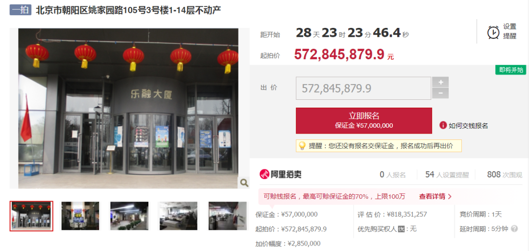 8月10日,阿里拍賣網(wǎng)顯示,北京市朝陽(yáng)區(qū)姚家園路105號(hào)3號(hào)樓1-14層不動(dòng)產(chǎn),即樂融大廈(此前名為樂視大廈),將于9月9日拍賣,起拍價(jià)5.73億元。