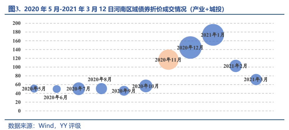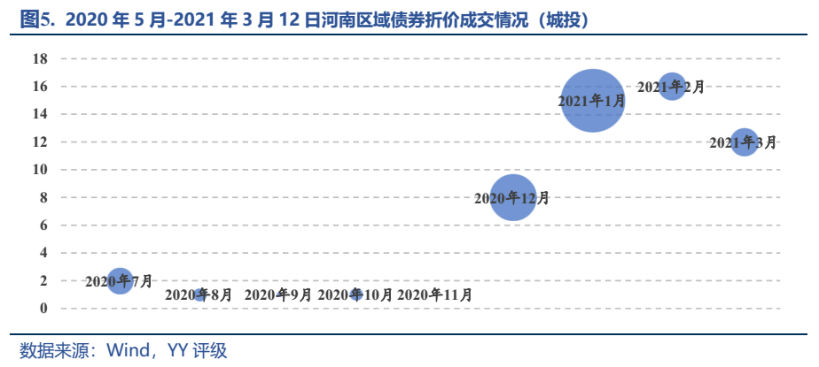 注:①縱軸為成交筆數,若單日內某只債券在多個市場多次成交,僅記為一筆成交,即單只債券日成交筆數不超過1筆;②氣泡大小為成交額;③折價成交以收益率高于8%來計算。