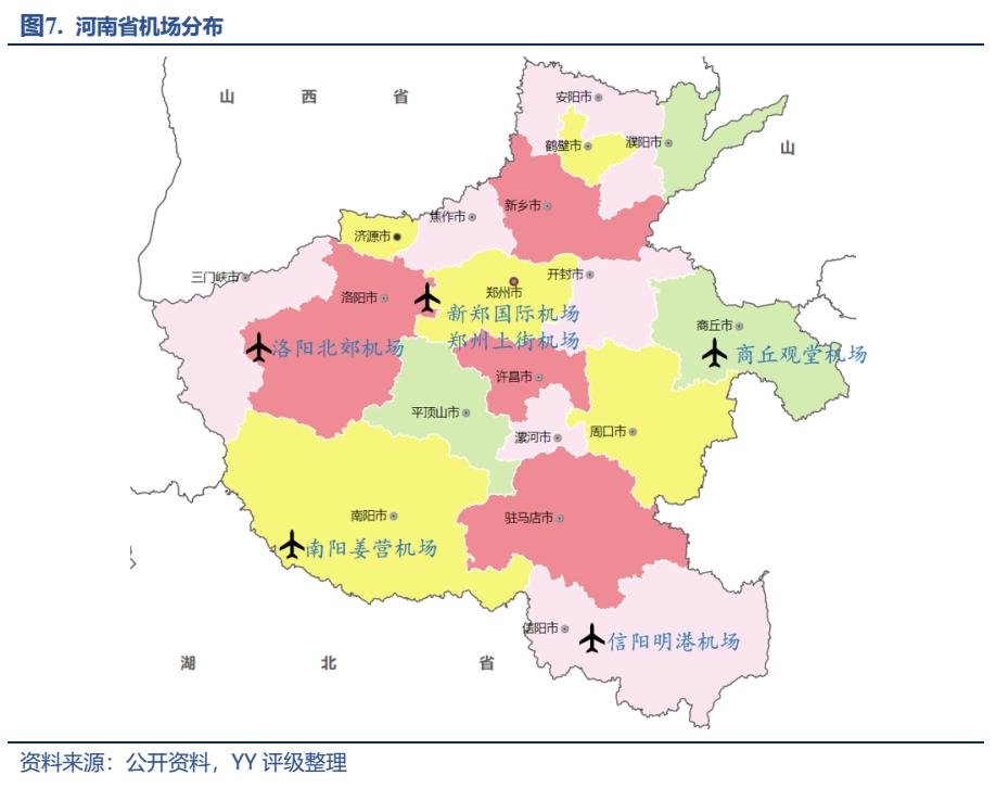 除了密集交錯的鐵路、公路線外,地處內陸的河南為了走出去,2013年建立了鄭州航空港經濟綜合實驗區,開始了問天要路的發展之旅。航空港區內的新鄭機場作為中國八大區域性樞紐機場之一,借助于港區強大的手機終端生產能力,在貨郵吞吐量中排名全國第七;同時2.5小時的航空圈可覆蓋全國人口的90%,旅客吞吐量排名全國十二,航空樞紐地位顯著。另外除了新鄭,省內還有其他5個機場分別位于洛陽、南陽、商丘、信陽,完善補充了全省的航空體系。