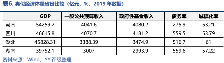 相比類似或稍弱經濟體量的省份,四川、湖北、湖南的債務率均超過了500%,而河南的債務率不到300%,留有較多撬動杠桿的空間。