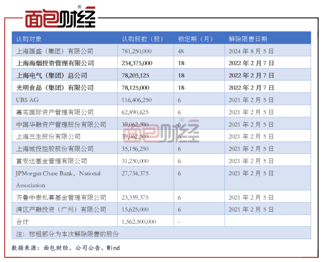本次上市流通的限售股為上海海煙投資管理有限公司、上海電氣(集團(tuán))總公司、光明食品(集團(tuán))有限公司所持有的限售期限18個(gè)月的限售股。截至2021年上半年末,上述三大股東分別持有公司6.35億股,2.63億股和4.52億股,占公司總股本的比例分別為4.86%、2.01%和3.46%,均為公司前十大股東。