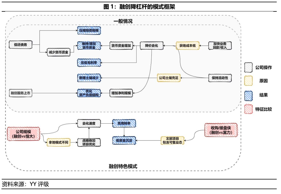 如圖1,根據融創的財務相關數據整理出上方的“一般情況”,并結合與富力和恒大的比較匯總下方“融創特色模式”的降檔成功原因。其中,融創具備了“獲地成本低(收購特殊機會項目)”、“土儲充足(具備2020年減少拿地的資質)”、“拿地模式不同(收購鎖定核心區位并結合去化速度,加快非剛需樓盤的高周轉)”和“文旅項目具可變現性(資金沉淀小)”等。