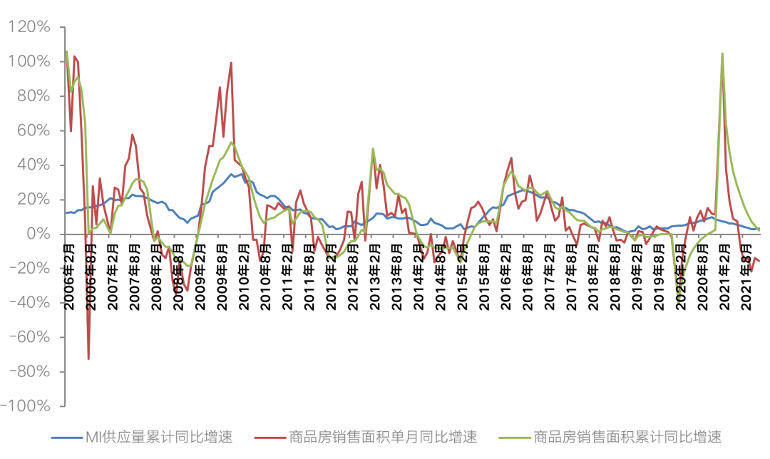 圖:2006年至今M1供應量累計同比增速、商品房銷售面積單月及累計同比增速