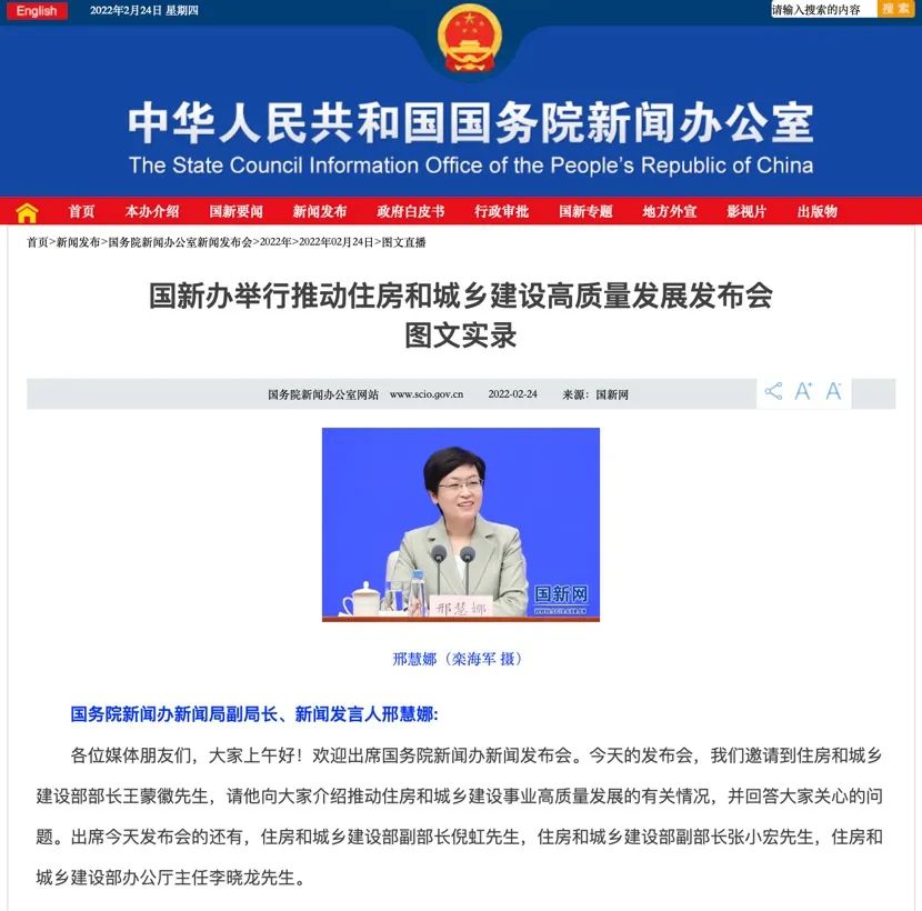 2022年2月24日,國新辦舉辦“推動住房和城鄉建設高質量發展發布會”,提出重點抓好加強房地產市場調控、推進住房供給側結構性改革、實施城市更新行動、實施鄉村建設行動、落實碳達峰碳中和目標任務、推動建筑業轉型升級、推動改革創新和法治建設、加強黨的建設等工作,推動住房和城鄉建設事業高質量發展。