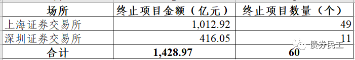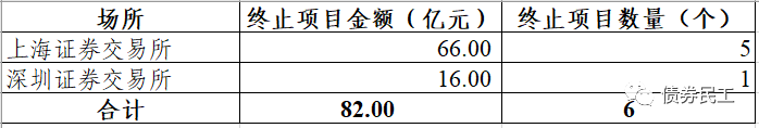 分交易所情況來(lái)看,上海證券交易所終止金額為66億元,占比為80.49%;深圳證券交易所終止金額為16億元,占比為19.51%。