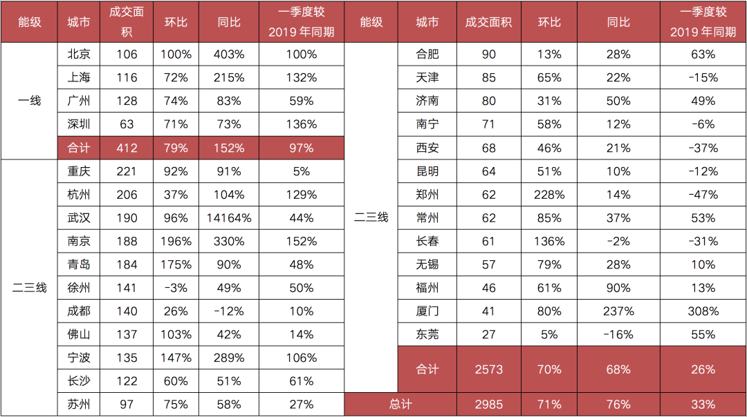3月,24個重點監測二三線城市整體成交約2573萬平方米,環比增長70%,同比增長68%,但一季度累計規模較2019年同期增長僅26%,與一線城市差距明顯,從具體城市來看,杭州、南京、寧波、廈門等熱點城市1-3月累計漲幅較2019年同期也已超過100%,與此同時,天津、西安、昆明、鄭州、長春等城市1-3月成交規模較2019按同期出現了不同程度的下滑,從這些重點監測的城市可以看出,二三線城市間的分化明顯,部分城市熱度不亞于一線城市,部分城市則出現了下調。