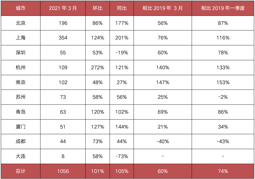 2021年3月,4個一線城市整體新房成交約412萬平方米,環比大增79%,同比增長152%,創近3年新高,由于2020年一季度受新冠疫情影響較大,整體市場停擺,整體基數較低,同比增長數據僅作參考,從今年1-3月較2019年一季度同期數據來看,漲幅仍有97%,這主要得益于充沛的市場購買力,尤其是北京、上海、深圳三大城市較2019年同期漲幅都在100%以上,分別為100%、132%和136%。
