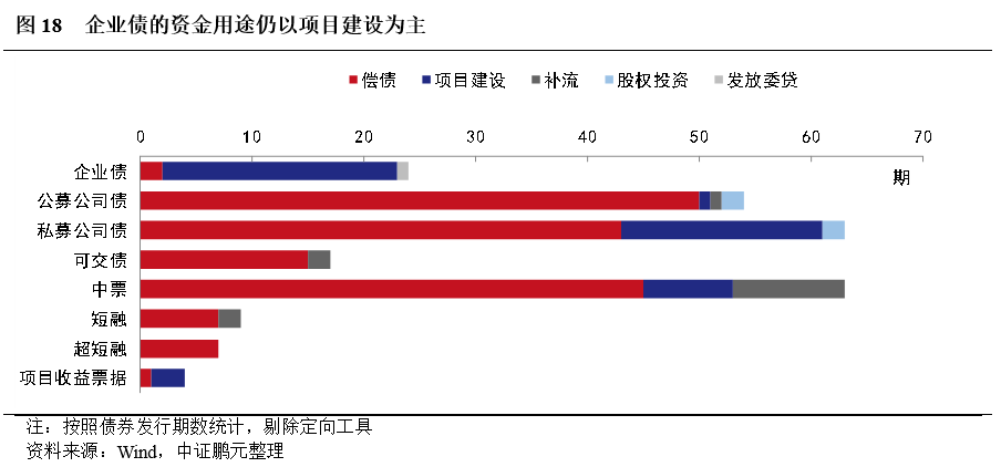 從城投和產業來看,115期披露資金用途的城投債中,用于償債的有68期,占比為59.1%,用于項目建設的有46期,占比為40.0%。126期披露資金用途的產業債中,用于償債的有102期,占比為81.0%,用于補流的有15期,占比為11.9%,用于項目建設的僅5期,占比為4.0%(圖19)。