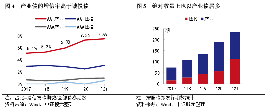 分產業和城投來看,相同級別下,相較于城投主體而言,產業主體的信用風險通常會更高,近五年高級別產業債和城投債的增信比例對比證實了這一點。從圖4可以看出,產業債的增信比例要比同級別城投債的增信比例高,并且AA+產業債的增信比例在逐年上升,而高級別城投債的增信比例則普遍較低,甚至在2017、2018、2020年三個年度AAA城投債的增信比例為零。同時,由于產業債的發債基數本就高于城投債,因而在絕對數量上,高級別增信債券仍然以產業債居多(圖5)。
