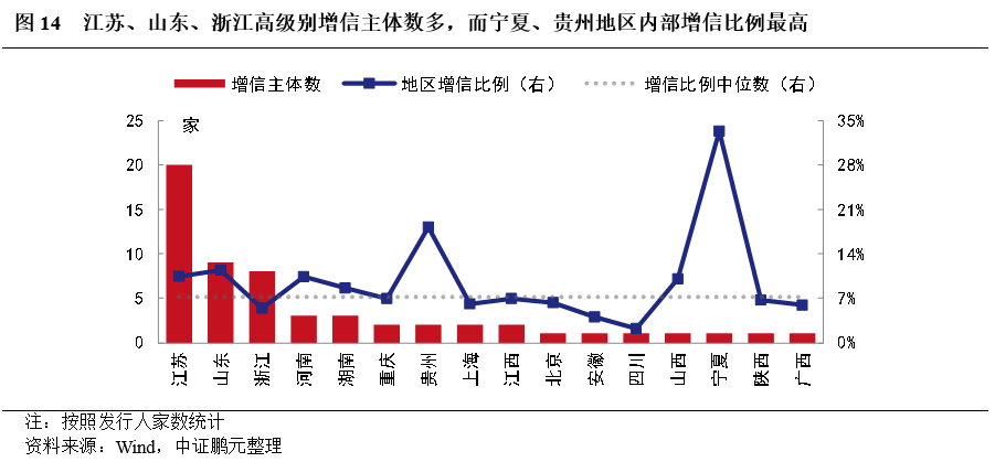 其次,按“增信發債的高評級主體數/地區內部全部高評級主體數”來看地區內部的增信主體比例,寧夏和貴州地區內部的增信比例最高,而云南、天津、東三省、內蒙古、廣東、河北、福建以及西北等地區的增信比例為零(圖14)。增信比例最高的兩個地區寧夏和貴州的增信比例分別為33.3%和18.2%,其次為山東、江蘇、河南,增信比例分別為11.4%、10.4%、10.3%,還有山西、湖南兩地的增信比例也高于全國中位數(7.1%)水平。而云南、天津、東三省、內蒙古、廣東、河北、福建以及西北等地區的高評級城投主體發債均未采取增信措施。