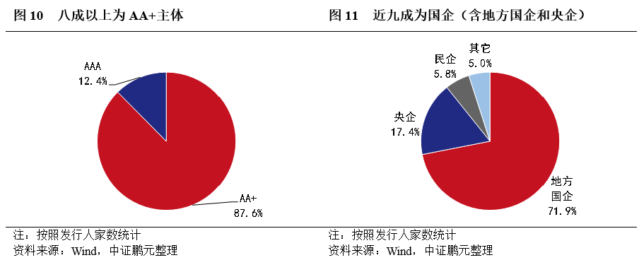1.總體來看,按主體計,AA+占比遠高于AAA,國企占比遠高于非國企,近半數為城投主體