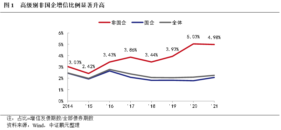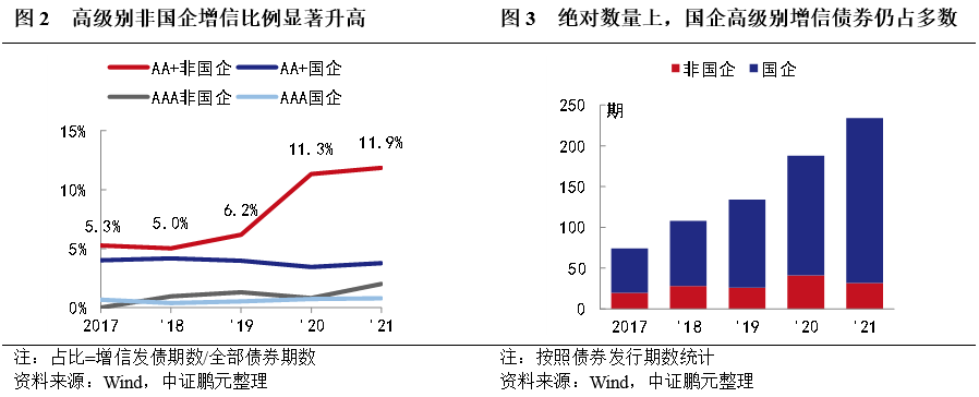 細分級別來看,AA+級增信發債的比例高于AAA級,AA+級非國企增信發債的比例顯著高于AA+級國企增信比例,特別是2020年和2021年大幅提升至11%以上水平(圖2),或與近兩年的民營企業持續風險爆發導致市場風險偏好降低有關。但從增信債券的期數來看,因高級別國企的發債基數顯著大于高級別非國企,因而在絕對數量上,高級別主體增信發債的企業性質仍以國企為主(圖3)。