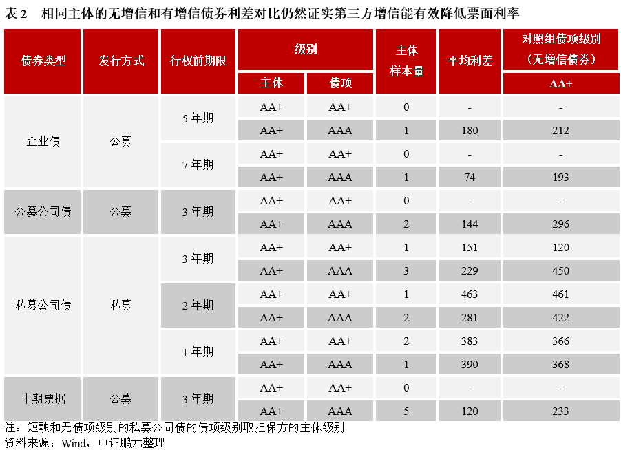 3.外部第三方增信能有效降低票面利率,對于從AA+提升至AAA的債券相當于提升半個小級別