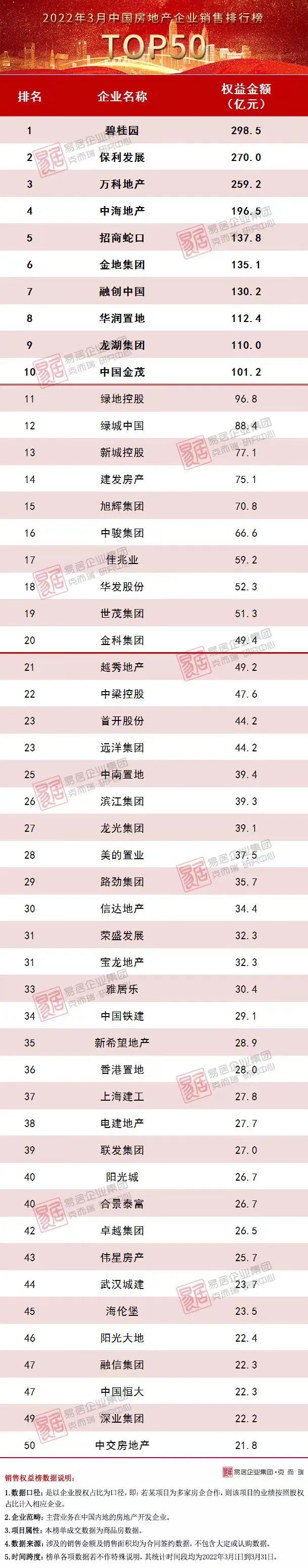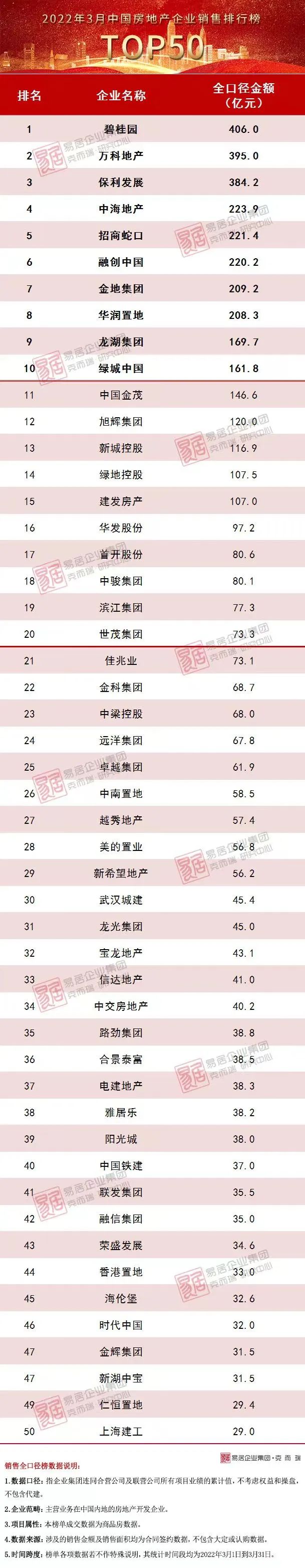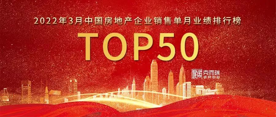 附:2022年3月中國房地產企業銷售排行榜TOP50