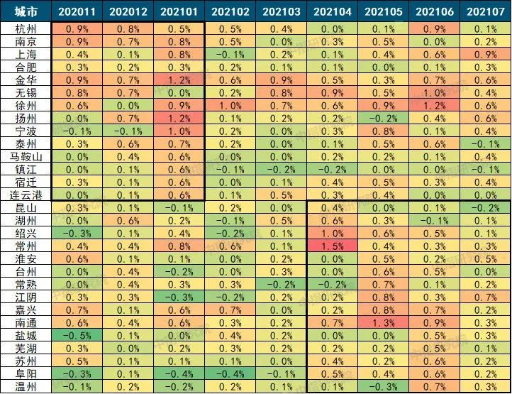 2020.10-2021.7長三角代表城市新房價格環比漲跌情況 圖表來源|CREIS中指數據(特此感謝)
