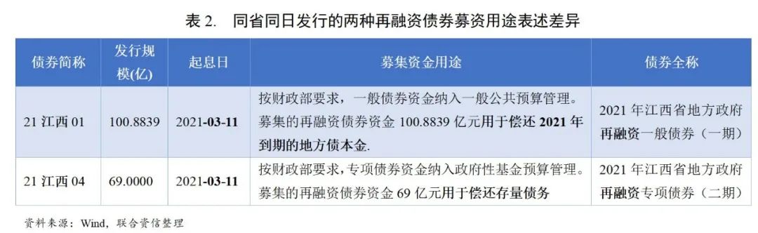 之所以采用再融資債券助力償還地方政府隱性債務(wù),或主要由于融資債券用途具備靈活調(diào)整的可能性。在當(dāng)前的地方政府債券制度框架下,新增債券及置換債券用于化解現(xiàn)期債務(wù)均面臨一定操作上的約束。新增債券方面,新增債券是“新增”的地方政府債務(wù),且由于新增一般債券受到預(yù)算赤字的約束,每年新增規(guī)模很小,如2021年我國預(yù)算安排新增地方政府債務(wù)限額4.47萬億元,其中一般債務(wù)限額僅0.82萬億元,專項債務(wù)限額3.65萬億元,新增專項債券規(guī)模雖然較多但其募集資金需受限用于新開工項目。置換債券是用于償還清理甄別認(rèn)定的截至2014年末全部非政府債券形式存量政府債務(wù)。因此,新增債券及置換債券均面臨一定操作上的約束。而再融資債券主要強(qiáng)調(diào)債務(wù)滾續(xù)的作用,募集資金用途具備一定靈活調(diào)整的可能性。