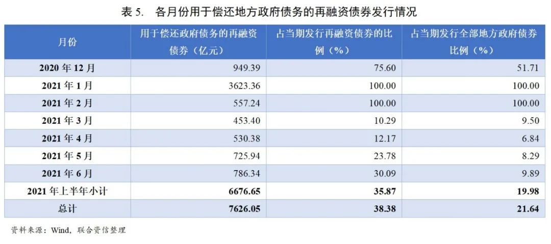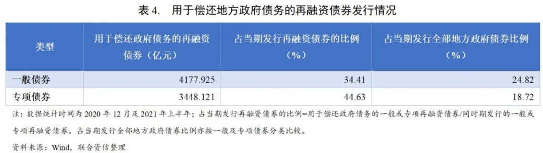 2020年12月及2021年上半年,用于償還政府債務(wù)的一般債券和專項債券分別為4177.93億元和3448.12億元,分別占同期發(fā)行再融資債券的比例為34.41%和44.63%,分別占同期發(fā)行全部地方政府債券的比例為24.82%和18.72%。化債用途專項債券在再融資債券中的占比相對較高,或由于地方政府隱性債務(wù)的認(rèn)定通常需要保證債務(wù)與公益性項目資產(chǎn)相對應(yīng),因此用于項目投資的專項債券或更適合對非債券形式的債務(wù)進(jìn)行置換。