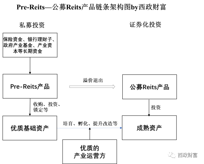 在上述架構中,Pre-Reits聯(lián)合諸如保險資金、銀行理財子資金、政府產(chǎn)業(yè)投資基金、產(chǎn)業(yè)資本等長期資金共同成立Pre-Reits私募股權投資基金,在一級市場提前鎖定優(yōu)質資產(chǎn)(產(chǎn)業(yè)運營方若有優(yōu)質的基礎資產(chǎn),亦可納入相關的資產(chǎn)池),資金用于優(yōu)質項目的新建或存量優(yōu)質項目的收購,并綁定產(chǎn)業(yè)運營方深度合作。產(chǎn)業(yè)運營方通過將基礎資產(chǎn)培育、孵化、提升改造成為成熟資產(chǎn),在資產(chǎn)達到發(fā)行標準后,將項目資產(chǎn)打包為資產(chǎn)支持專項計劃并出售給Reits,并獲取一級市場股權投資及二級資本市場溢價退出的高額投資回報。