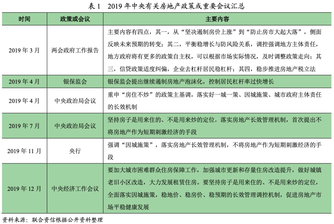 2019年以來,中央堅持“房住不炒”的政策總基調不變。從中央的調控思路看,中央對房地產泡沫化所帶來的金融風險、居民杠桿率快速增長等問題表現出了極大的重視,是本輪房地產企業融資端調控政策的起點;6月份以來,促進國民經濟戰略轉型訴求納入監管層的視野,壓縮房地產金融資源以促進國民經濟轉型亦成為政策調控的重要考慮因素。2019年7月,中央政治局會議首次提出“不將房地產作為短期刺激經濟的手段”;從2019年三季度開始,宏觀經濟下行壓力大,政府加大逆周期調節力度,9月全面降準+LPR降息,11月MLF降息,房地產政策向“松緊對沖”過渡。具體內容如下表所示。