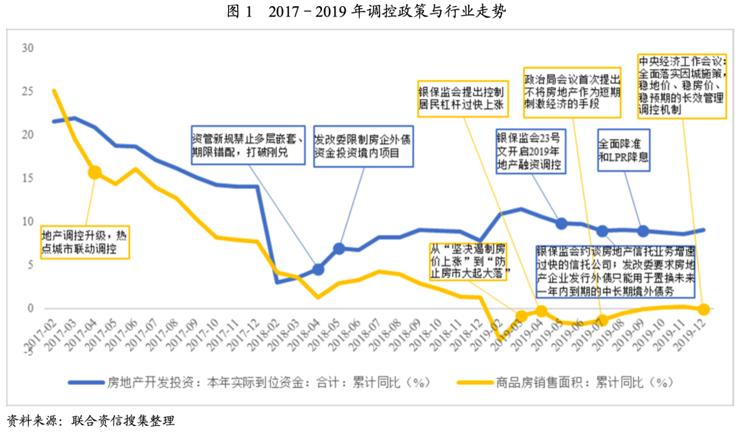 自2016年首提“房住不炒”以來,2017年調控升級,熱點城市聯動調控,2018年資管新規打破剛兌,禁止多層嵌套以及期限錯配。2019年,商品房累計銷售面積首次出現負增長,具體政策和行業走勢對應如圖1所示。