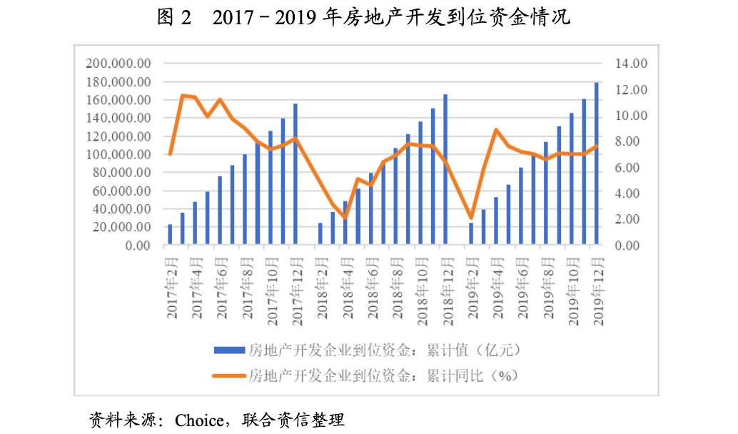 宏觀環境方面,2019年以來,貨幣政策整體寬松,全年三次降準,LPR的推行使得利率市場化更近一步,財政政策更為積極主動,大規模的減稅降費政策降低企業負擔,帶動實體企業企穩回升。房企融資方面,2019年整體呈現先揚后抑的態勢,年初房企融資延續了2018年的回暖態勢,出現了“小陽春”,但從二季度開始迎來了新一輪更加嚴峻的調控,針對房地產的融資政策更為嚴格,對房企融資端的監管進一步加強,意在遏制房地產泡沫化傾向、防范房地產金融風險。2019年房地產開發到位資金同比增長7.6%,比2018年增長1.2個百分點。