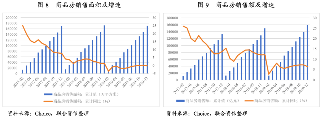 從市場表現看,2019年初房地產行業經歷了小陽春,但下半年很快迎來拐點。從數據看,2019年,全國商品房銷售面積171.6萬億平方米,同比下降0.1%,銷售面積略有回落;商品房銷售額15.97萬億元,同比增長6.5%,雖然增速有所下滑,但全年銷售額仍保持增長。