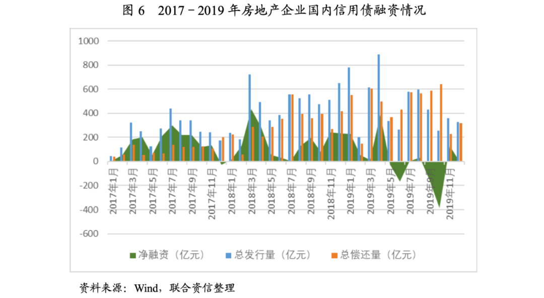 信用債方面,2018年3季度以來,在企業“借新還舊”需求增長以及整體資金面緊張緩解、交易所對房企發債有所放松的情況下,房企公司債發行開始逐步回暖;2019年初房企信用債發行迎來小陽春,發行規模和凈融資規模均大幅增長,但一季度后,隨著銀保監會等部門監管措施出臺,房企信用債融資收緊,凈融資規模小甚至為負。
