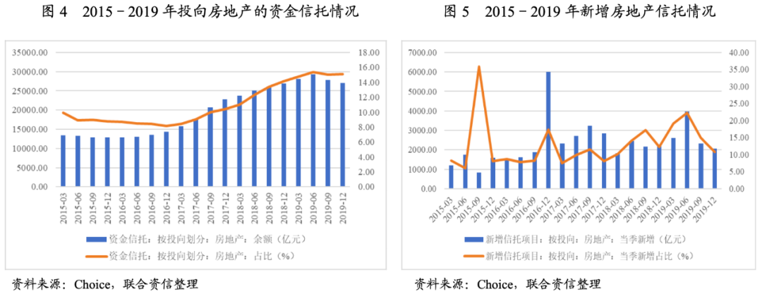 信托貸款方面,2019年7月銀保監會先后約談了部分房地產信托業務增速過快、增量過大的信托公司,要求其控制業務增速,提高風險管控水平;同時要求信托公司的房地產信托業務需事前報告,監管部門將進行逐筆審核;事前業務報告僅接受符合“四三二”條件且交易結構為貸款模式,此外對于因合規原因被退回事前報告的房地產信托業務,將嚴肅追究合規審查責任。受此影響,自2019年3季度起,房地產信托新增金額及占比、投向房地產領域的資金信托余額及占比均出現下滑,且該下滑態勢延續至今。