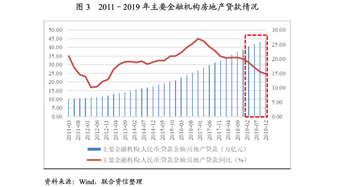具體來看,銀行等金融機構方面,2019年5月,銀保監會發布了23號文《關于開展“鞏固治亂象成果促進合規建設”工作的通知》,明確要求商業銀行、信托、租賃等金融機構不得向四證不全、開發商/股東資質不達標、資本金未足額到位的房地產開發項目直接提供融資,或通過股權投資+股東借款、股權投資+債權認購劣后、應收賬款、特定資產收益權等方式變相提供融資,由此開啟了2019年房地產融資調控;7月,央行“點名”房地產行業占用了較多的信貸資源,旨在引導銀行合理控制房地產貸款投放,并加強對高杠桿經營的大型房企融資行為的監管和風險提示。在相關政策的影響下,主要金融機構對房地產的貸款雖保持增長,但增速逐漸放緩。