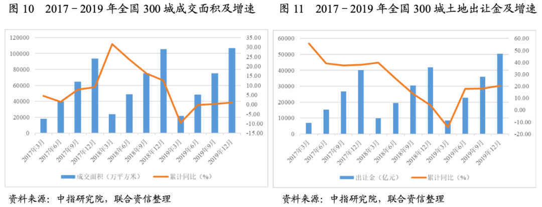 土地市場方面,2019年土地市場整體平穩,“穩字當頭”的調控政策明顯。2019年,全國300個城市共推出土地面積12.98億平方米,同比增長1%;成交面積10.66億平方米,同比減少1%;出讓金總額50294億元,同比增長19%;土地溢價率13.1%,與上年基本持平。但2019年下半年以來受房地產調控政策收緊,金融監管持續加強的影響,土地流拍率有所提高。