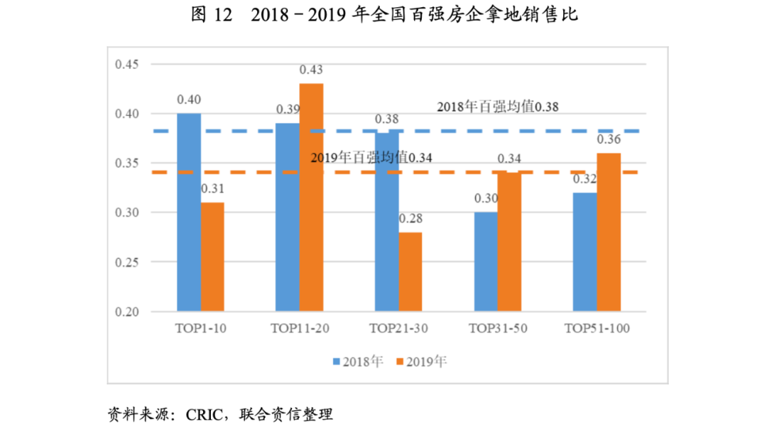 2019年二季度,部分二線熱點城市土地市場迎來小陽春,部分開發商獲取的部分項目溢價率超過100%,需關注未來上述項目的去化及盈利情況。2019年,百強房企拿地銷售比較2018年有所下降,但TOP10~20及TOP30~50沖規模意愿不減,將會影響其未來現金流的穩健性。