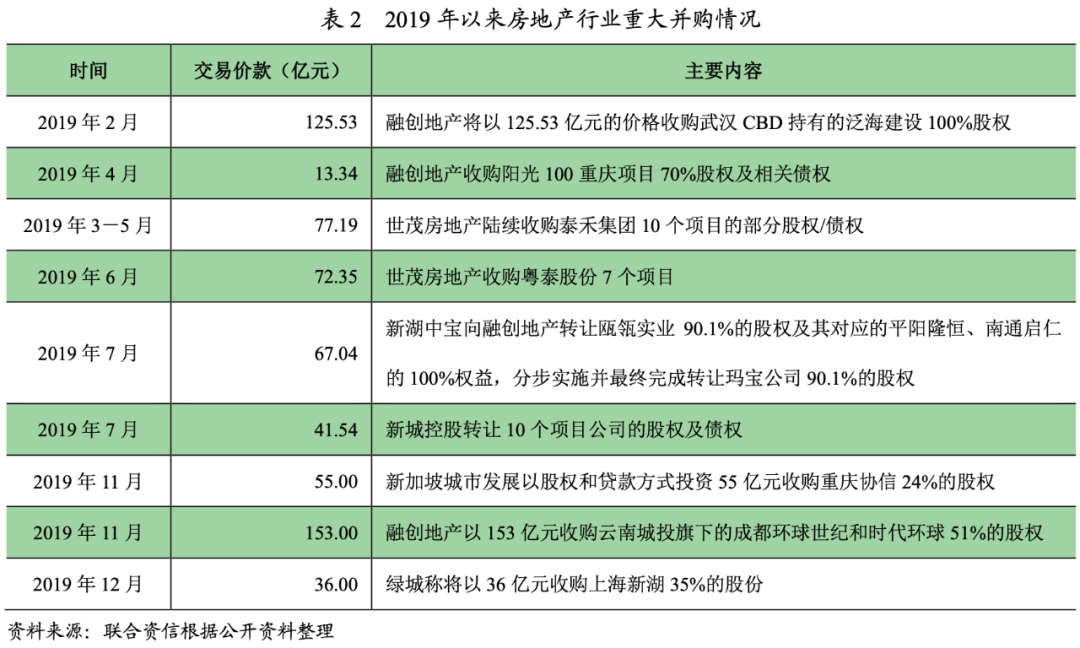 房地產行業經過高速擴張的野蠻生長期后,城鎮化率的新水平、棚改的逐步退出、政策基調不動搖的環境背景決定了房地產企業不會再出現單邊上漲的行情,隨著存量時代的不斷深入,房企生存的二八定律越發明顯(即20%的房企掌握著80%的資源),第一梯隊房企開始紛紛尋找第二增長極、第二梯隊房企仍然在筑造規模的護城河、處在尾部的房企面臨洗牌和出清。此外,在房地產行業下行壓力下,行業競爭由增量競爭轉為存量競爭,加之行業調控趨緊,行業集中度不斷提升,排名靠后的房企獲利能力及融資能力弱,行業孕育了較多的并購整合機會;同時,部分房企由于自身降杠桿的需要(如泰禾集團和新城控股),不得已拋售項目以尋求資金周轉,資產包轉讓的行為也相對頻繁。隨著地產后開發時代的到來,2019年末行業大并購事件頻發,“大魚吃大魚”的局面開始展現,具體情況如下表所示。