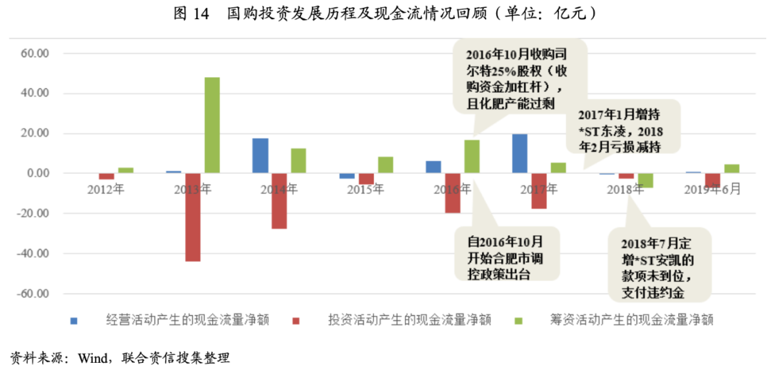 2016年10月21日,公司子公司國購產業控股有限公司與安徽省寧國市農業生產資料有限公司簽署了《股份轉讓協議》,以15.80億元受讓司爾特1.80億股流通股股份,占司爾特已發行總股本的25%,成為該公司控股股東。司爾特業務以化肥生產為主,對公司跨界經營和業務整合能力形成挑戰,且與公司主業缺乏協同效應,在現金流本不就充裕且外部融資空間有限的情況下,多元擴張加速了公司資金消耗和風險積累。