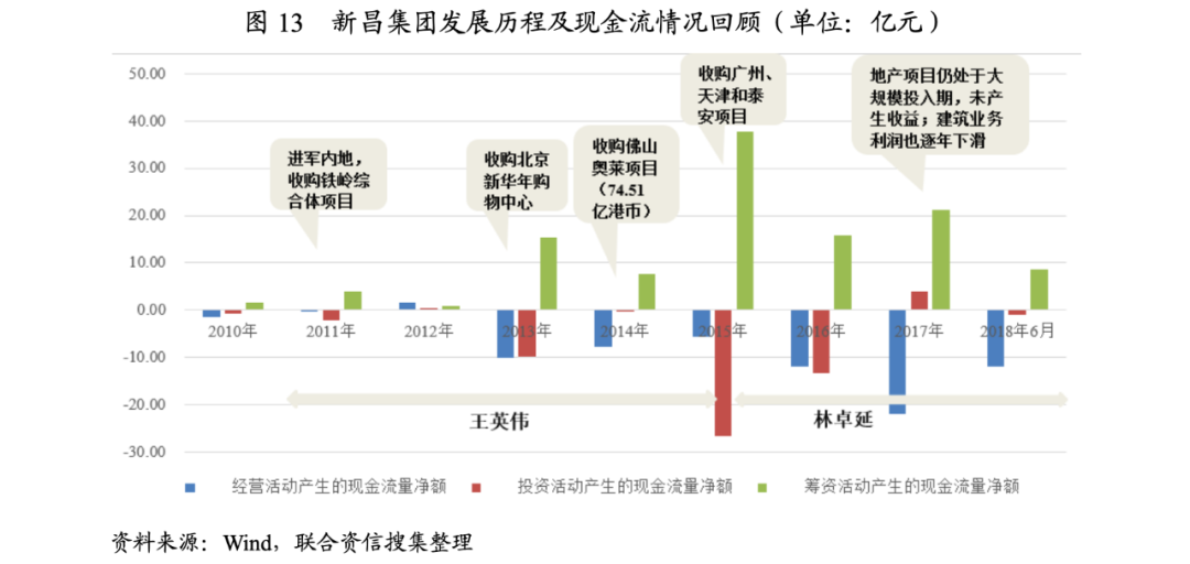 我們將新昌集團進軍內地房地產市場的時間節點和現金流情況進行對比,回顧其發展歷程我們可以發現:公司自2011年開始確立了以商業綜合體的模式進軍內地房地產市場的策略,首個項目為收購獲取的鐵嶺項目,其后幾年內斥資百億元以上收購了6個地產項目,但除北京項目外均屬于投資回報周期長且處于大規模投入未產生現金流的狀態,高度依賴籌資活動;2016年以來核心的建筑業務利潤也逐年下滑,具體情況如下圖所示。