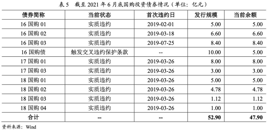 國購投資有限公司成立于2010年,是安徽省較大的區域性房地產開發企業之一,主營住宅地產、商業地產的開發與銷售,商業物業管理及運營,實際控制人為自然人袁啟宏。截至2021年6月底,公司共10只債券處于違約狀態,具體情況如下表所示。