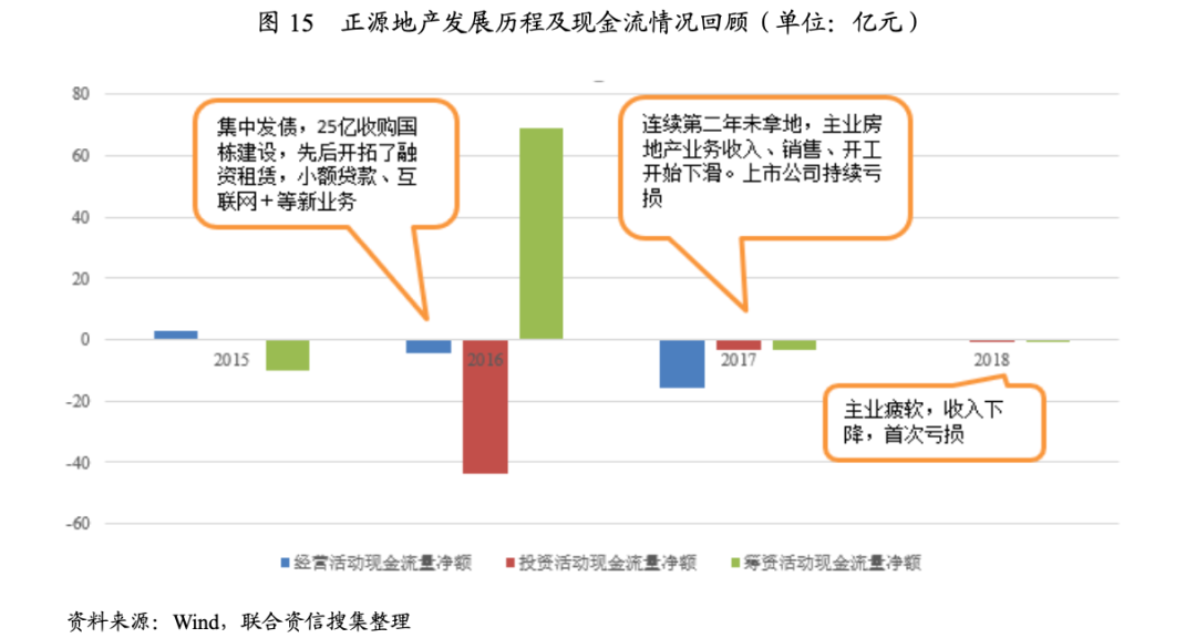 正源地產早期開發的“幸福e家”項目有一定的區域競爭力,口碑形象較佳,但2016年開始,正源地產盲目聚焦金融投資熱點,借助于寬松的融資環境,大舉發債,杠桿收購上市平臺,進軍建材、融資租賃,小額貸款、“互聯網+”等新興業務。2017年,公司房地產業務下滑,上市公司持續虧損,投資回報不及預期,籌資活動前現金流持續凈流出,造血能力逐步削弱,并走向債務危機。