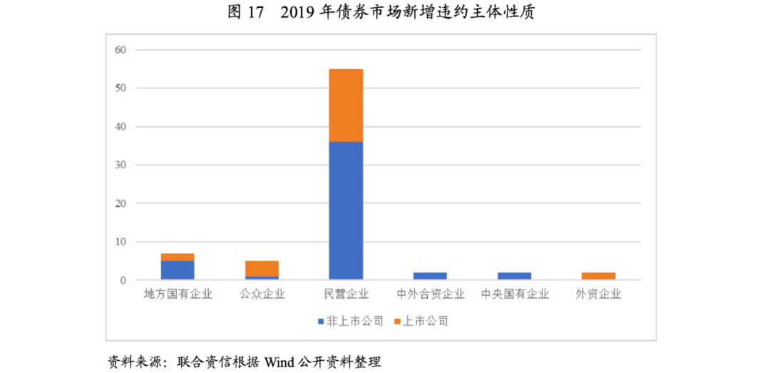 從違約主體類型來看,2019年,民企依舊是主要違約主體,一方面,經濟增速換擋,傳統業務為主的民企盈利能力趨弱,供給側改革使得民企聚集的中下游行業盈利再度受擠壓;另一方面,信用收縮周期,疊加包商銀行事件,中小銀行信用供給進一步下降,對民營企業融資造成不利影響,主業不強、融資激進、業務過于多元的企業信用風險逐步暴露。此外,地方國有企業違約數量開始增加,主要分布在青海、遼寧、內蒙古等經濟實力較弱,可調配金融資源有限的區域。