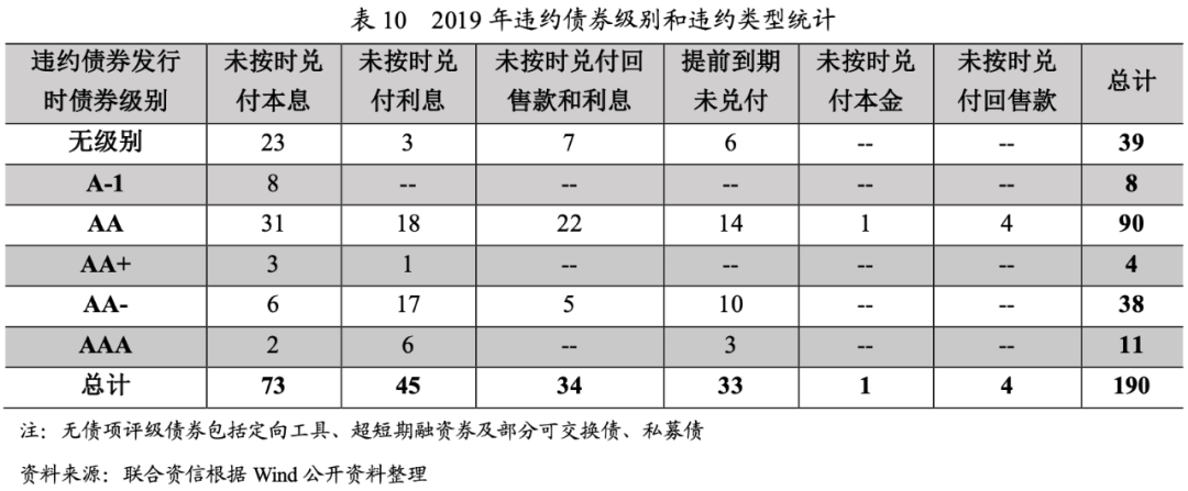 從違約前債券級別來看,2019年違約債券級別集中于AA及以下,但存在向中高評級蔓延趨勢,AAA債券違約數量開始大幅增加;從違約類型來看,違約類型以未按時兌付本息和未按時兌付利息為主,但技術性違約、本息展期、場外兌付、要求撤銷回售以及永續債展期或利息遞延等“非違約”的“花式違約”形式頻頻出現。