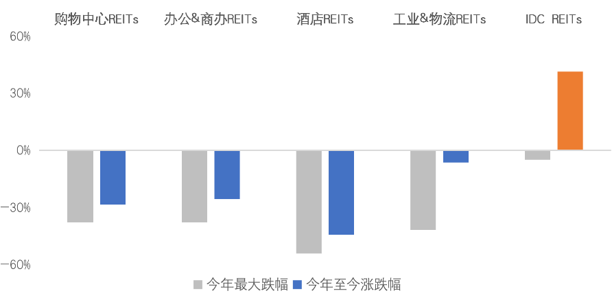 3月黑天鵝事件下,隨著美股的多次震蕩,新加坡&香港市場REITs行情在3月23日來到今年最低點(diǎn),其中酒店類REITs跌幅最大,跌幅超5成,以數(shù)據(jù)中心為底層資產(chǎn)的IDC REITs跌幅最小僅有4.8%。