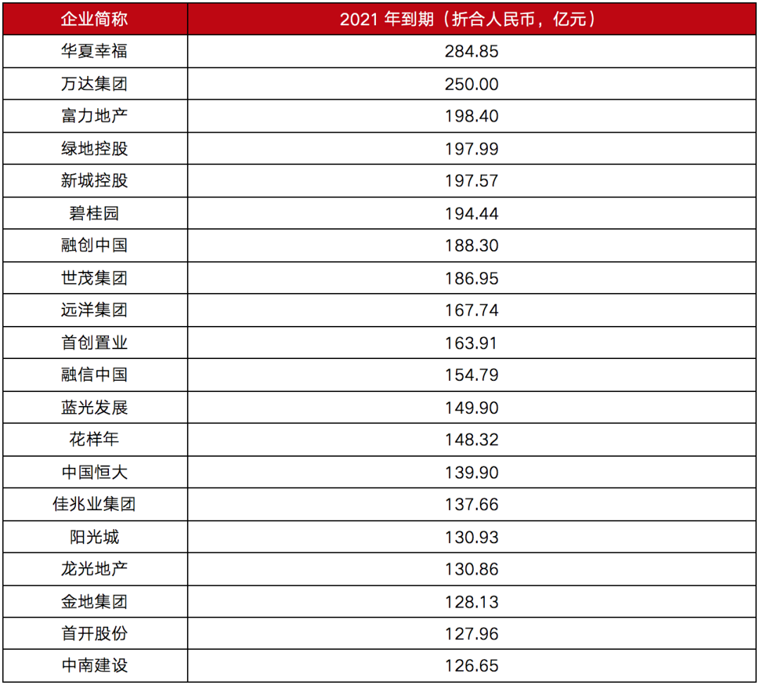由于目前政策供需兩端限制房企融資,面對(duì)2021年的償債高峰,雖部分房企提前償還了共計(jì)約460億元的債券,但數(shù)額較小。具體企業(yè)而言,2021年到期債券最高為華夏幸福,需償還284.85億元,其次為萬(wàn)達(dá)集團(tuán),兩家企業(yè)均突破二百億元。整體來(lái)看,房企償債及經(jīng)營(yíng)壓力巨大,未來(lái)可能誕生更多的債券違約。