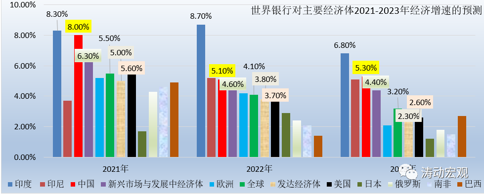 2、除日本、印度兩大經濟體分別上調0.30個百分點和1.20個百分點外,世界銀行普遍下調了其它經濟體的增速(美國下調0.50個百分點、歐洲下調0.20個百分點、中國下調0.30個百分點、俄羅斯和巴西分別下調0.80和1.10個百分點)。也即總體上看,2022年世界銀行對日本和印度更為樂觀,對美國、歐洲、中國的預測的更偏悲觀。