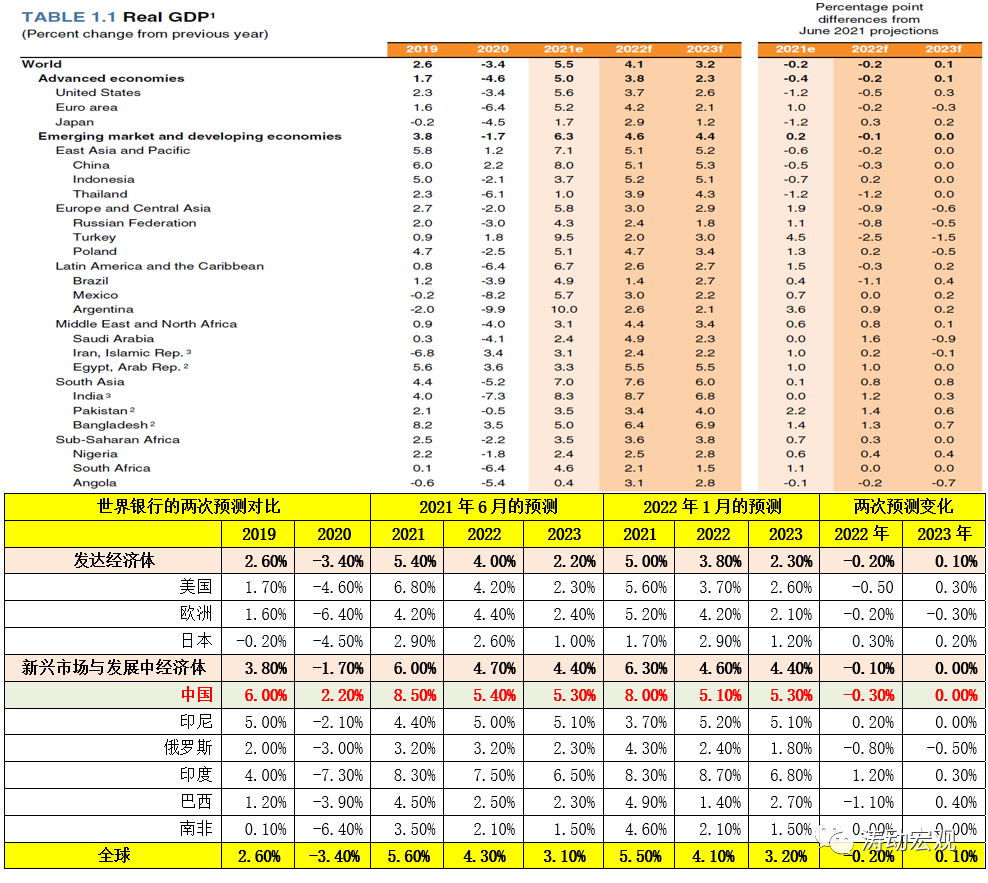 (一)2022年1月11日,世界銀行發布最新的《全球經濟展望》,普遍下調了全球經濟增長預期,并明確指出全球增長正進入一個明顯放緩的時期,經濟放緩態勢將延續至2023年,因疫情傳播、持續的供應鏈瓶頸和通脹壓力以及金融脆弱性加劇等因素使得發展中經濟體“硬著陸”風險上升。具體看,