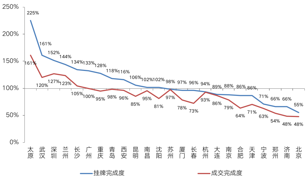 各個(gè)城市供地完成情況基本一致,基本呈現(xiàn)中西部城市“超標(biāo)”、而樓市下行城市供地不足的分化格局。