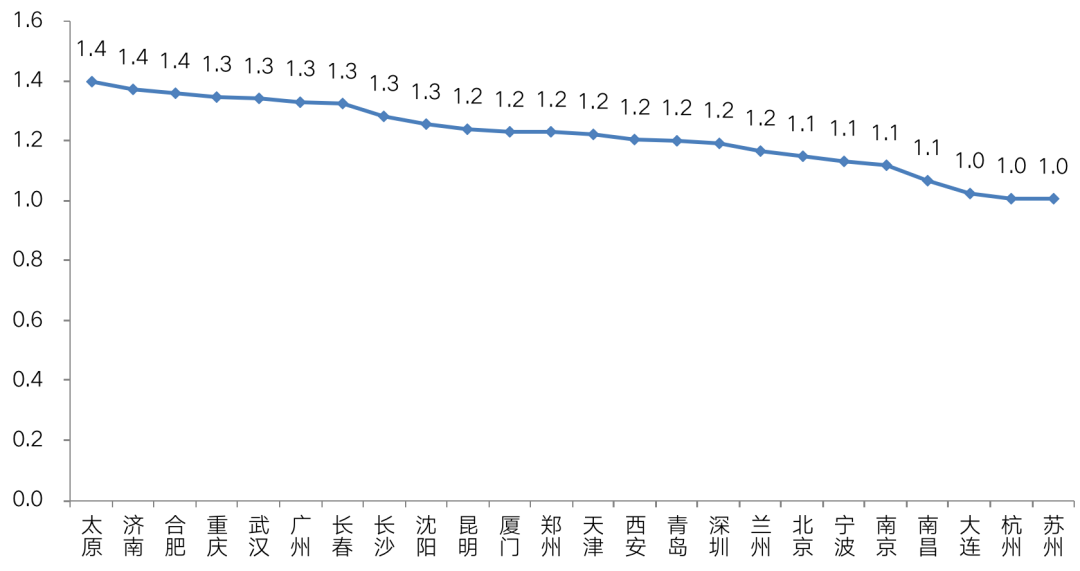相比之下,杭州、寧波、南昌等供求比較均衡(供求比均在1.1及以下)的城市,流拍率則處于相對(duì)較低水平,溢價(jià)率也處于相對(duì)高位。典型如杭州,2020年涉宅土地流拍率(按幅數(shù))僅有2%,而溢價(jià)率卻高達(dá)21%,土地市場熱度明顯高于供求比較高的城市。