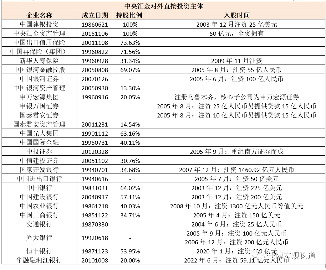 (一)2003年12月16日,中央?yún)R金成立(注冊資本8282.09億元),成立時注冊資本為3724.65億元,其主要職能是代表國家行使對重點金融企業(yè)的出資人的權(quán)利和義務。其中,中央?yún)R為中投的全資子公司,而后者被稱為中國版的主權(quán)財富基金,是國資委的全資子公司。