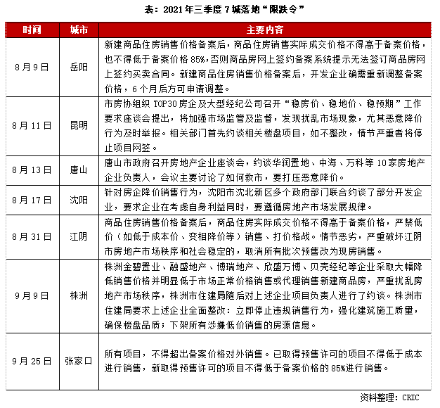 出于穩(wěn)房價、穩(wěn)預期的需要,岳陽、昆明等7城相繼落地“限跌令”。其中,岳陽、江陰明文規(guī)定禁止大幅降價,昆明、唐山、沈陽、株洲采取約談的方式,禁止房企、中介機構惡意降價、打價格戰(zhàn),擾亂房地產(chǎn)市場秩序。