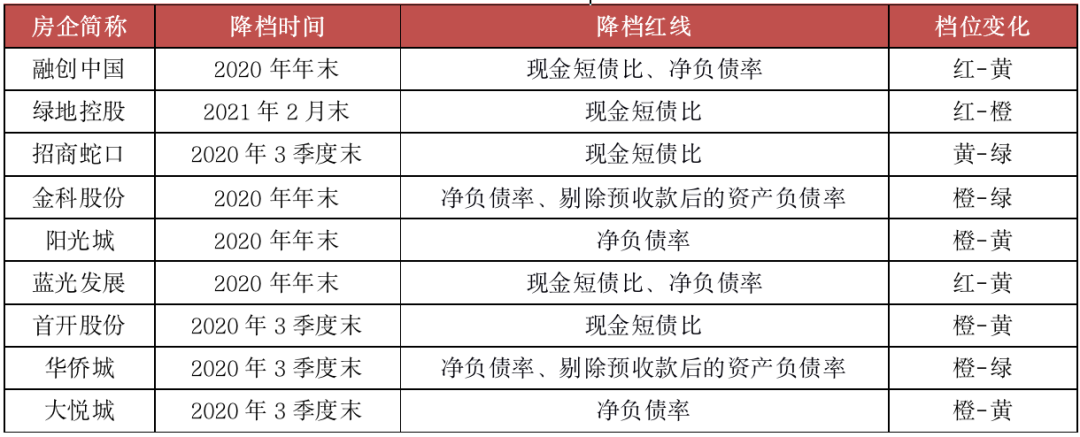 據統計,目前已有多家房企成功降檔,截止至2020年三季度,招商蛇口、首開股份、華僑城、大悅城等房企成功降檔;截止至2020年年底,融創、金科、陽光城、藍光等房企成功降檔;2021年2月末,綠地稱提前“轉綠”達標。