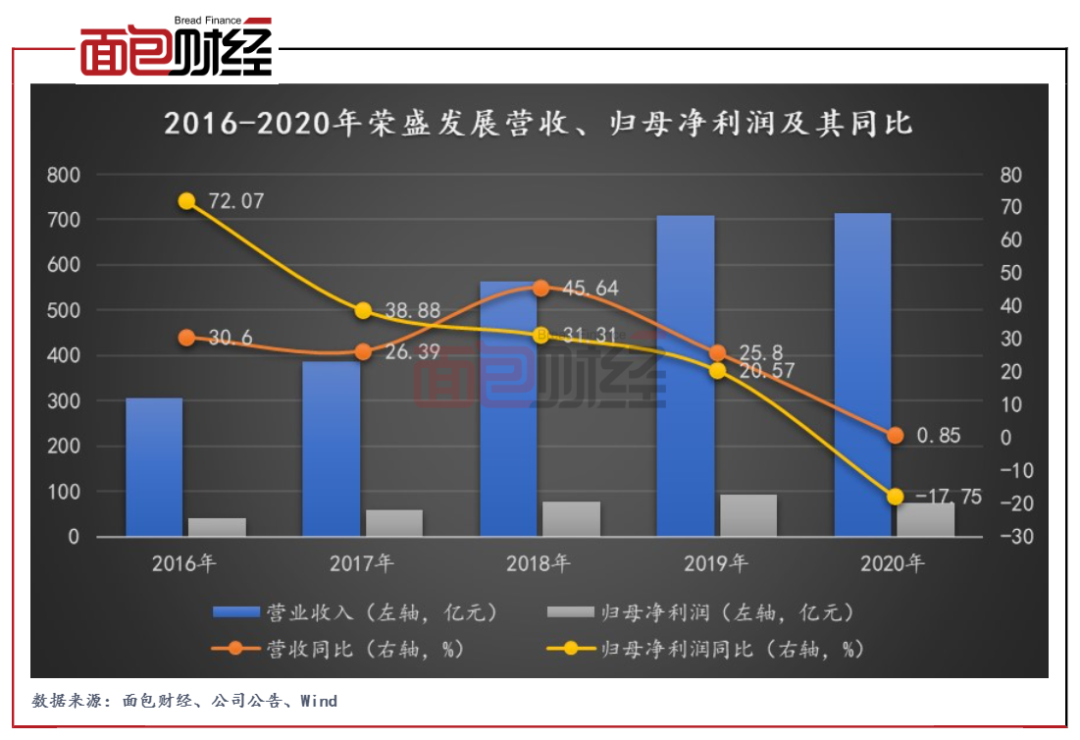 榮盛發(fā)展于近日發(fā)布2020年年報(bào)及2021年一季報(bào)。財(cái)報(bào)顯示,公司2020年實(shí)現(xiàn)營收715.11億元,同比僅增長0.85%,營收增速自2018年以來持續(xù)放緩;實(shí)現(xiàn)歸母凈利潤75.01億元,同比下降17.75%,近五年來首次轉(zhuǎn)負(fù)。