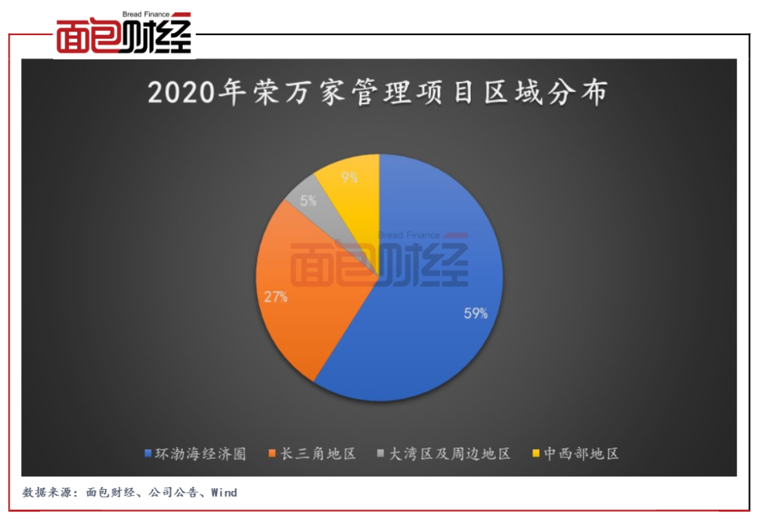 在管項(xiàng)目區(qū)域的分布上,按在管項(xiàng)目收入計(jì)算,榮萬家環(huán)渤海經(jīng)濟(jì)圈占58.9%、長三角地區(qū)占27%、大灣區(qū)(包括其周邊地區(qū))占5%、中西部地區(qū)占9%。