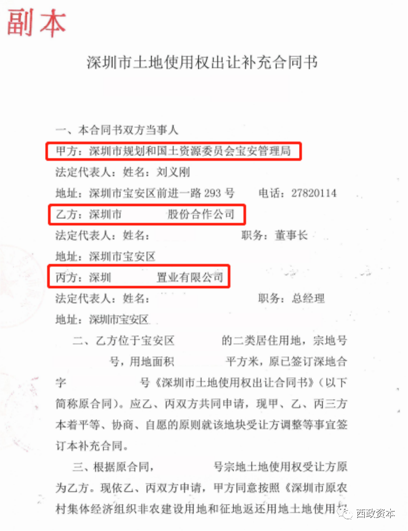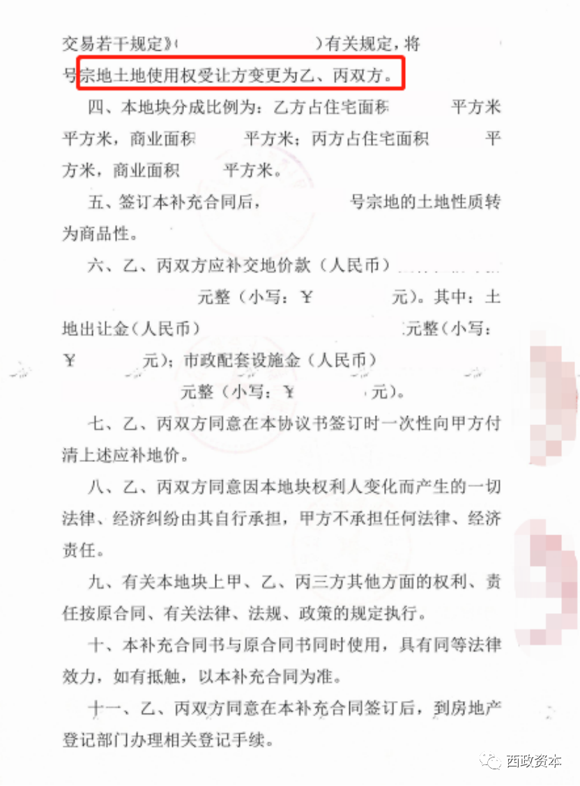 土地整備利益統籌項目的村股份公司留用地合作開發在雙抬頭的模式下,亦涉及將原屬于村股份公司的留用地變更至村股份公司和開發商雙方名下的操作,也即由雙方共同持有土地使用權。目前實務操作一般是規劃和自然資源部門先跟村股份公司簽訂《土地出讓合同》(村股份公司為受讓人),然后由規劃和自然資源部門、村股份公司及開發商三方再簽訂《土地出讓合同補充協議》,將土地使用權的受讓人變更為村股份公司和開發商兩方,由雙方共同持有留用地土地使用權,也即土地證辦理完成后權屬人是雙主體。具體項目報批報建時,由開發商和村股份公司一起作為雙主體進行申報,所有對政府的手續和文件都需要雙方蓋章,包括預售合同也都是雙方蓋章,當然,為避免操作上的繁瑣問題,常見的做法是在預售前村股份公司出具經公證的委托書,全權委托開發商辦理所有后續手續和預售、物業管理聘請等事宜。物業分配時,村股份公司和開發商再按照土地出讓合同和補充協議約定的分配比例分配物業,下圖為利益統籌項目留用地《土地出讓合同補充協議》的示例。